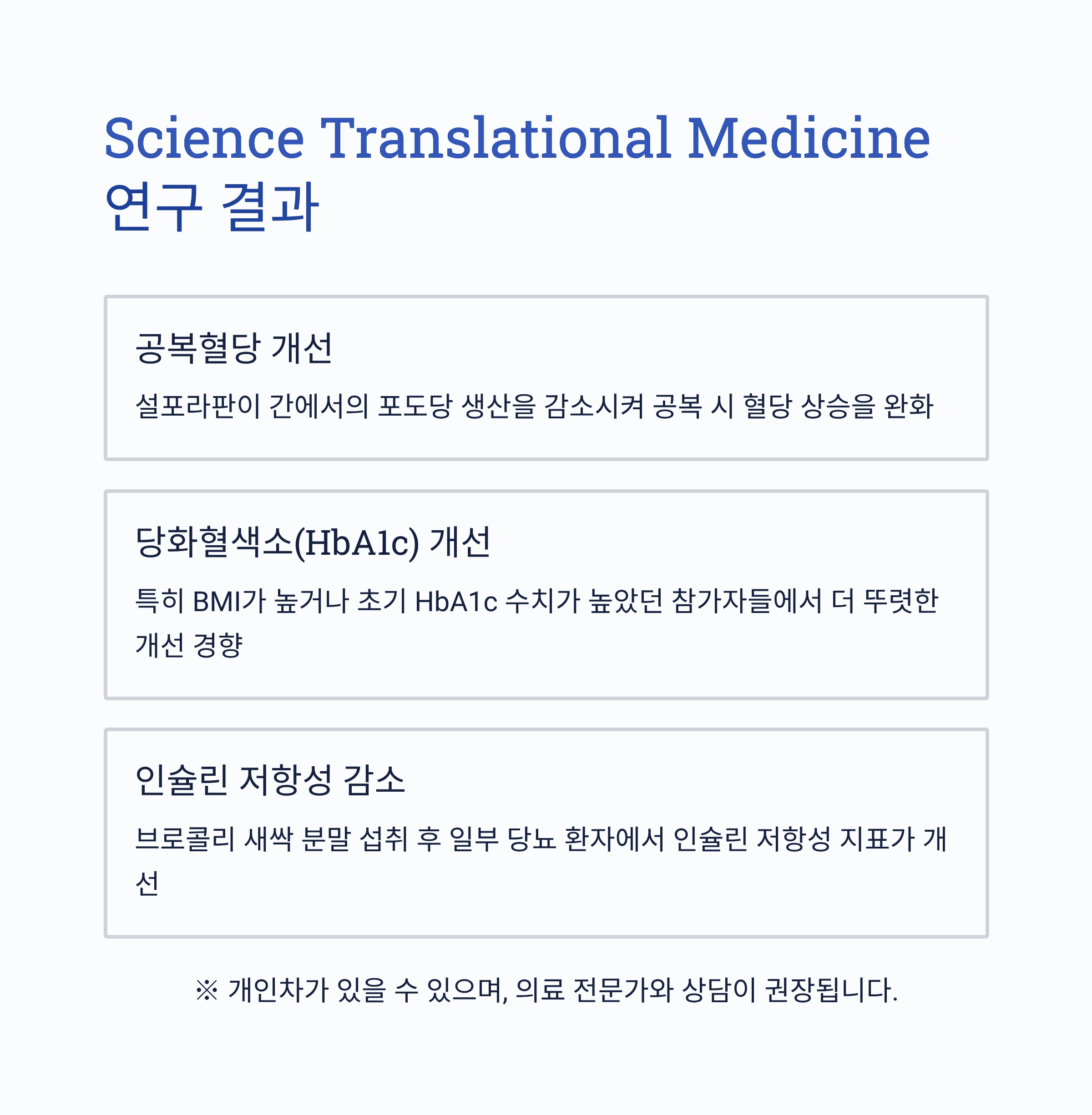 - Science Translational Medicine (2017): 설포라판이 간에서의 포도당 생산을 감소시키고 제2형 당뇨 환자의 혈당조절에 도움이 될 수 있다는 가능성이 제시되었습니다.