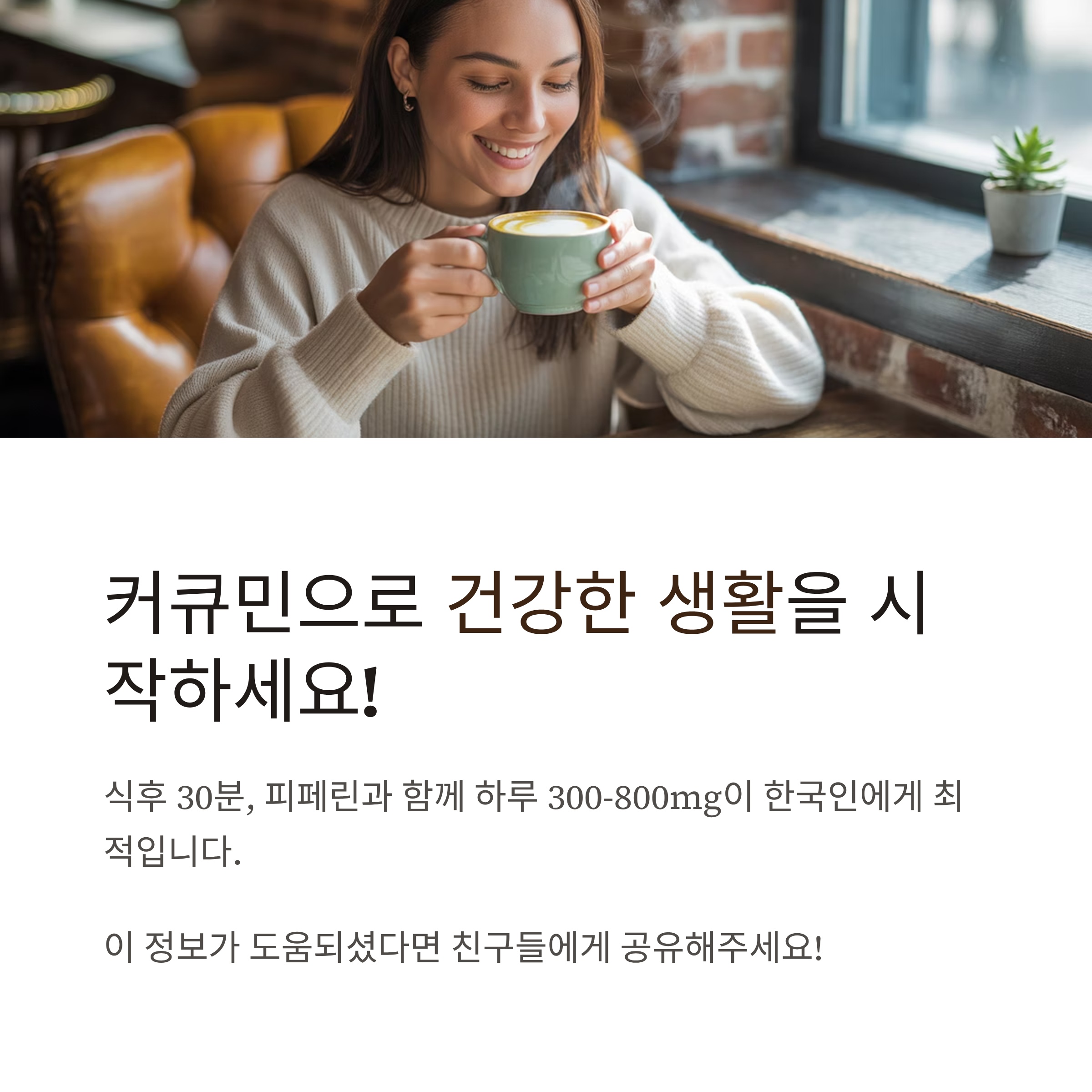 - 방법: 식후 30분, 피페린과 함께 하루 300-800mg (한국인 최적화 용량), 김치·된장과 시너지