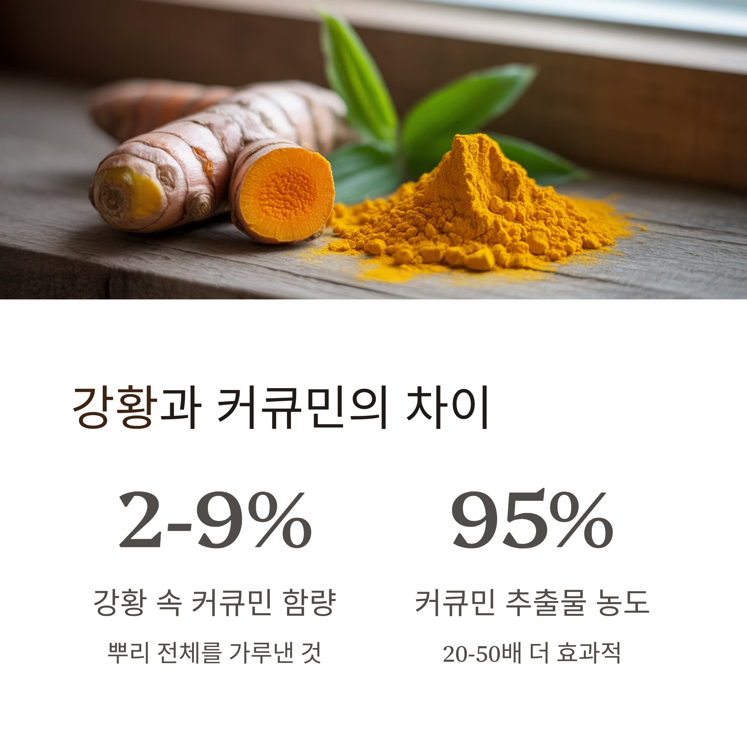 완벽 차이점 정리: 강황은 뿌리 전체를 가루낸 것으로 커큐민 함량이 2-9%에 불과하지만, 커큐민 추출물은 95% 고농축입니다. Harvard Health에 따르면 건강 효과를 위해서는 커큐민 추출물이 20-50배 더 효과적입니다.