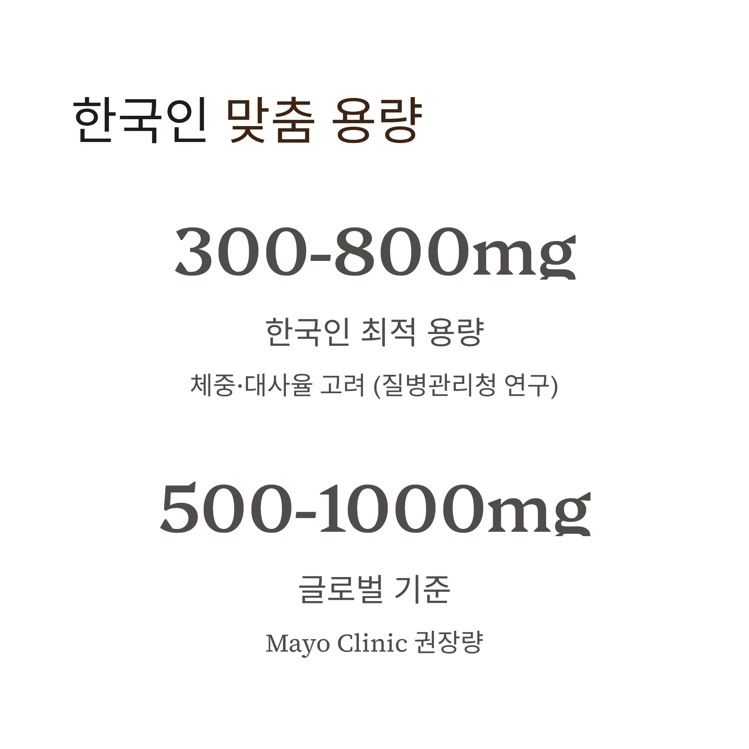 • 한국인 최적화: 하루 300-800mg (체중·대사율 고려)